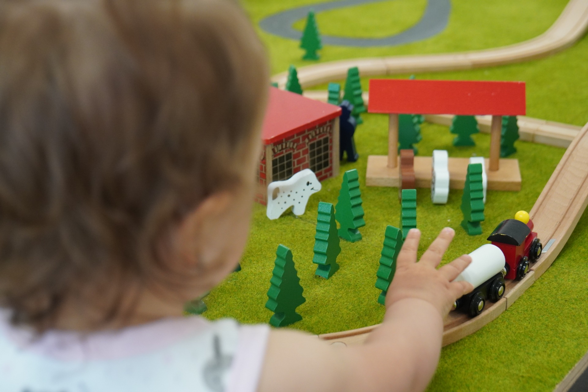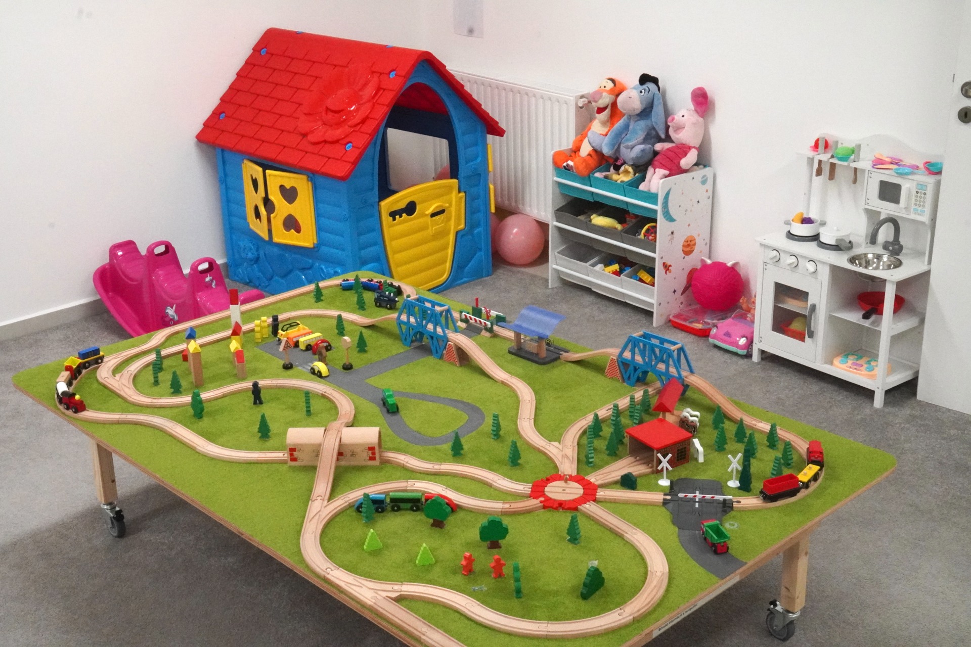 A játszószoba közepén egy fa terepasztal található, ahol már 1 éves kortól megismerkedhetnek a gyermekek a terepasztal játszhatóságával.